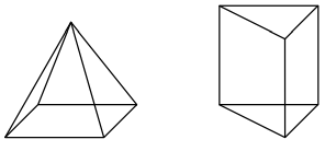 Na rysunkach przedstawiono ostrosłup prawidłowy i graniastosłup prawidłowy. Wszystkie krawędzie obu brył są jednakowej długości.