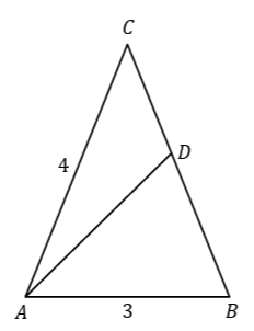 W trójkącie równoramiennym ABC dane są: |AC|=|BC|=4 i |AB|=3. Na boku BC, między punktami B i C, wybrano taki punkt D, że trójkąty ABC i BDA są podobne (zobacz rysunek).