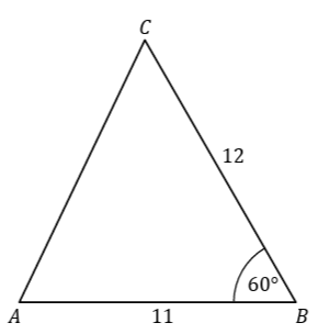 Dany jest trójkąt ABC, w którym |AB|=11, |BC|=12 oraz |∡ABC|=60° (zobacz rysunek).
